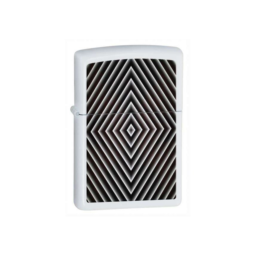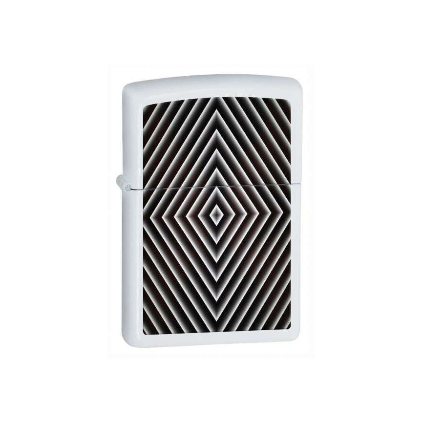A patterned theme Zippo Lighter with Geometric White Matte finish and design. This model has the following design elements: Patterned, Standard Size case, White in colour. This Zippo features a Powdercoat Matte White finish. This lighter is fluid fuelled
