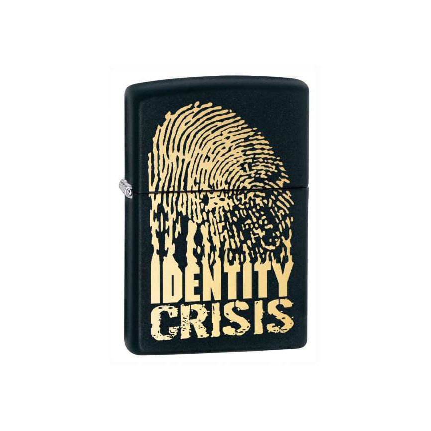 A text/statement theme Zippo Lighter with Identity Crisis Black Matte finish and design. This model has the following design elements: Text and Statements, Standard Size case, black in colour. This Zippo features a Powdercoat matte black finish. This ligh
