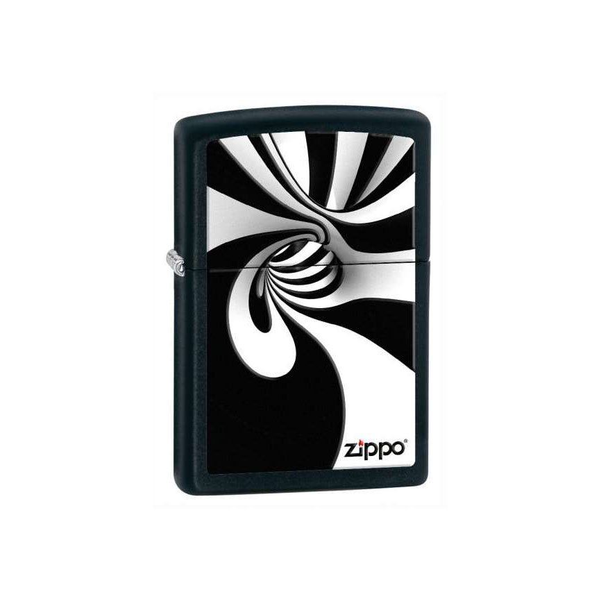 A patterned theme Zippo Lighter with Spiral Black Matte finish and design. This model has the following design elements: Patterned, Zippo Logo, Standard Size case, black in colour. This Zippo features a Powdercoat matte black finish. This lighter is fluid