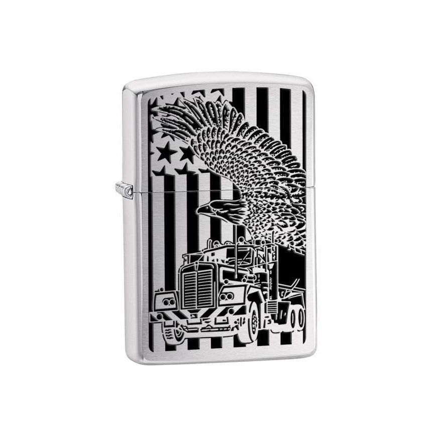 A Nature theme Zippo Lighter with Truck with Eagle Brushed Chrome finish and design. This model has the following design elements: Birds, Bats and Insect, Motoring, USA, Standard Size case, Chrome in colour. This Zippo features a Bare Metal Brushed Chrome